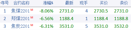 昨日夜盘,煤炭类期货重挫,截至夜盘收盘,焦煤(2731, -240.00, -8.08%)主力合约跌逾8%,动力煤(1188, -84.00, -6.60%)、焦炭(3531, -238.00, -6.31%)主力合约跌逾6%。