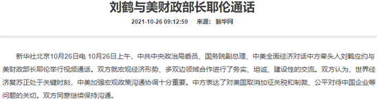据新华社报道,10月26日上午,中共中央政治局委员、国务院副总理、中美全面经济对话中方牵头人刘鹤应约与美财政部长耶伦举行视频通话。