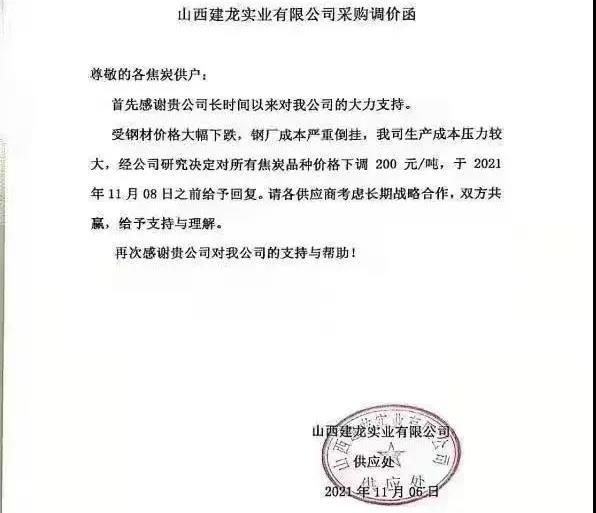 这两天,有钢厂发出采购焦炭(3102, 77.50, 2.56%)的调价函。函中指出:“钢材价格大幅下跌,钢厂生产升本严重倒挂,公司生产压力较大,经公司研究决定对所有焦炭品种(采购)价格下调200元/吨,于2021年11月8日之前给予回复等。”