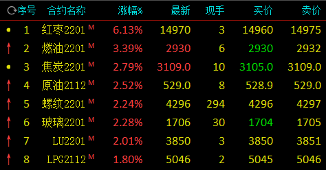 11月8日,国内期市开盘,红枣(14700, 595.00, 4.22%)涨逾6%,动力煤(930, -18.00, -1.90%)跳水跌逾2%;油脂大跌,棕榈(9160, -316.00, -3.33%)油、豆油跌逾3%。