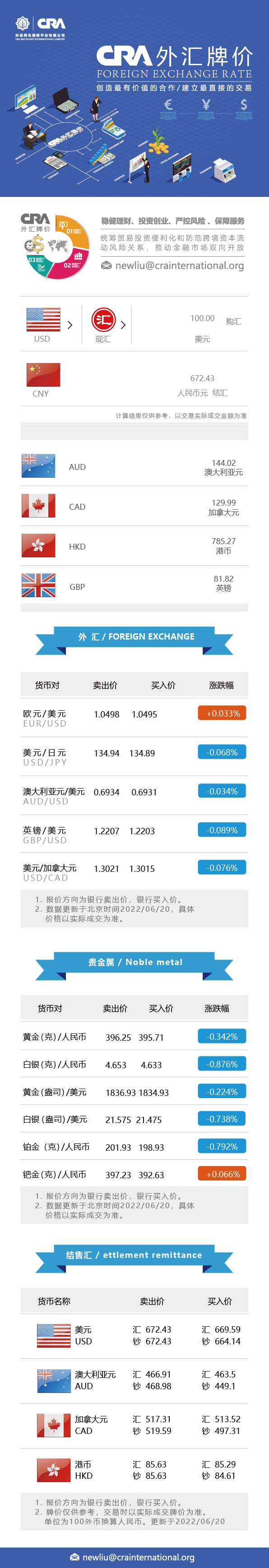 6月20日CRA贵金属及外汇市场价