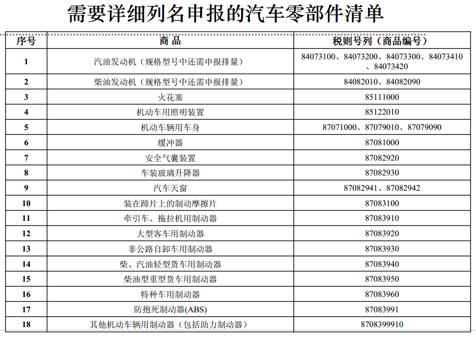 五、《需要详细列名申报的汽车零部件清单》由海关总署发布,并根据需要不定期调整、公布,需要及时关注海关总署的相关公告。