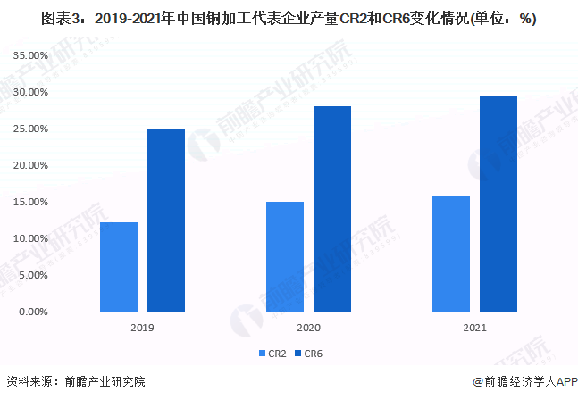 从市场规模集中度来看,2021年我国铜加工行业代表企业产量CR2达15.90%,相较于2020年增长了0.89个百分点;CR6的值为29.59%,相较于2020年增长了1.52个百分点。2019-2021年我国铜加工行业CR2和CR6均逐年上升,行业集中度有所提高。