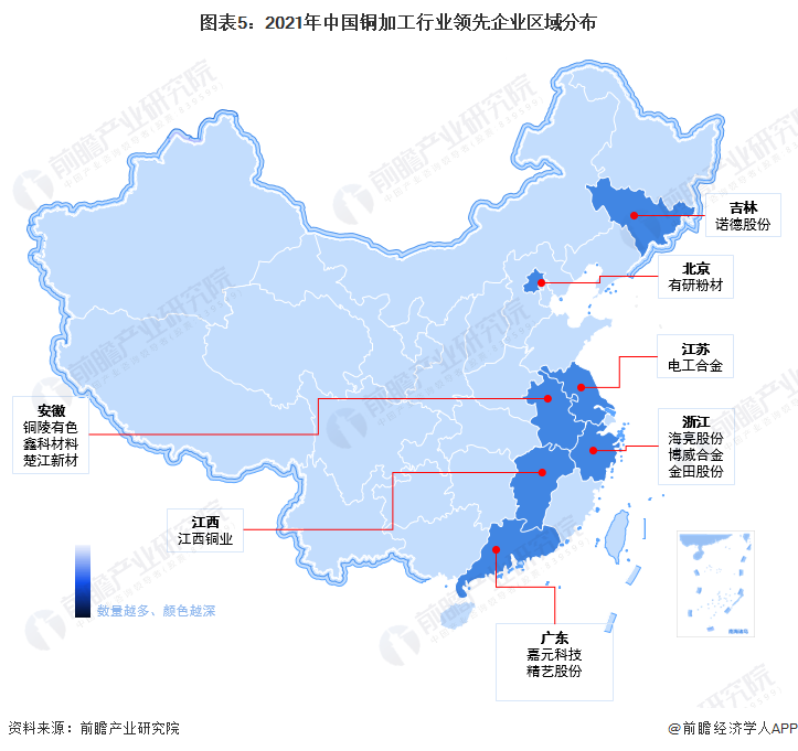 铜加工领先企业主要分布在安徽、浙江、广东、江西、北京、吉林、江苏等地,大多位于华东及华南地区,临近铜矿资源较为丰富的安徽、江西、湖北,且制造业发展基础良好,因而聚集了较多大型企业,是我国铜加工行业发展的摇篮。