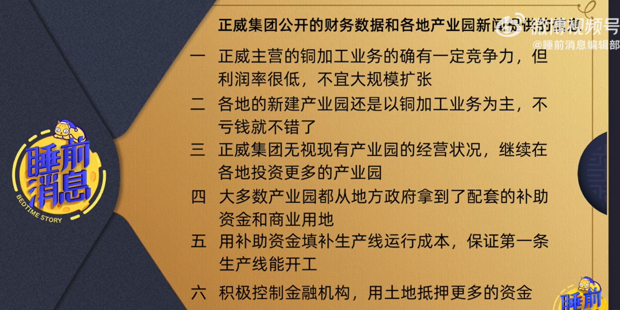 而引发投资者关注的自媒体视频认为,正威集团拥有的3000万吨铜资源无法查证、不知真假,同时根据正威集团早年发债披露的报表,质疑其纳税等情况。该自媒体还表示,正威系投建或拟投建的产业园区遍布全国,但公司方面并不重视这些产业园的开工情况,凭借产业园拿到政府补助及商业用地后继续扩大投资规模,同时积极控制金融机构,将取得的土地抵押取得更多资金。