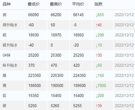 12月12日上海有色金属交易中心市场价