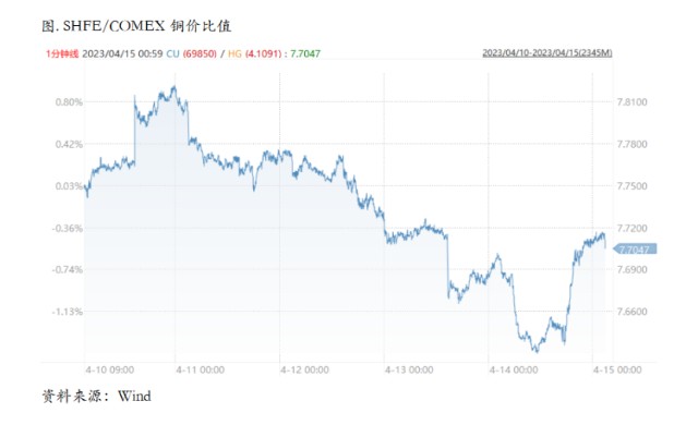 上周SHFE/COMEX比价高位震荡,目前国内需求有所恢复,社会库存和保税库存都出现了下降,整体较为乐观。需求后续继续恢复是大概率事件。后续国内冶炼厂集中检修的情况较多,供应扰动会显著高于下半年,加之单月长单进口量下降,月间的供需缺口被动放大,这给了更多的机会来让比价窗口打开。目前比价上行的阻力还是国内消费的复苏传导到库存和升水的变化上仍然需要时间,但海外风险事件不断、衰退预期难消除,因此也有可能是通过下跌来完成窗口的打开。