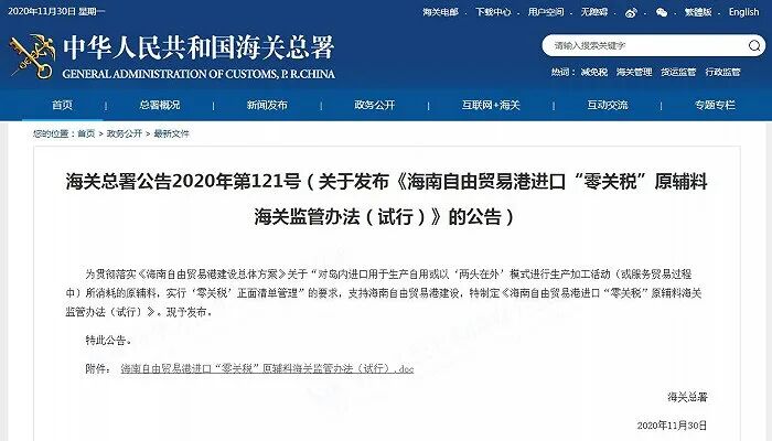 11月30日,为贯彻落实《海南自由贸易港建设总体方案》关于“对岛内进口用于生产自用或以‘两头在外’模式进行生产加工活动(或服务贸易过程中)所消耗的原辅料,实行‘零关税’正面清单管理”的要求,支持海南自由贸易港建设,海关总署制定发布《海南自由贸易港进口“零关税”原辅料海关监管办法(试行)》。