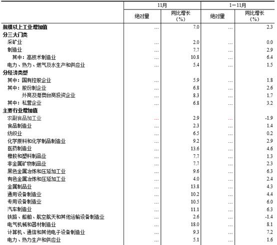 11月份,规模以上工业增加值同比实际增长7.0%(以下增加值增速均为扣除价格因素的实际增长率),增速较10月份加快0.1个百分点。从环比看,11月份,规模以上工业增加值比上月增长1.03%。1—11月份,规模以上工业增加值同比增长2.3%。