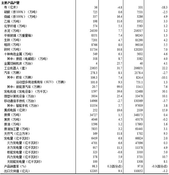 分产品看,11月份,612种产品中有439种产品同比增长。钢材11734万吨,同比增长10.8%;水泥24330万吨,增长7.7%;十种有色金属549万吨,增长6.1%;乙烯198万吨,增长11.6%;汽车278.3万辆,增长8.1%,其中,新能源汽车20.7万辆,增长99.0%;发电量6419亿千瓦时,增长6.8%;原油加工量5835万吨,增长3.2%。