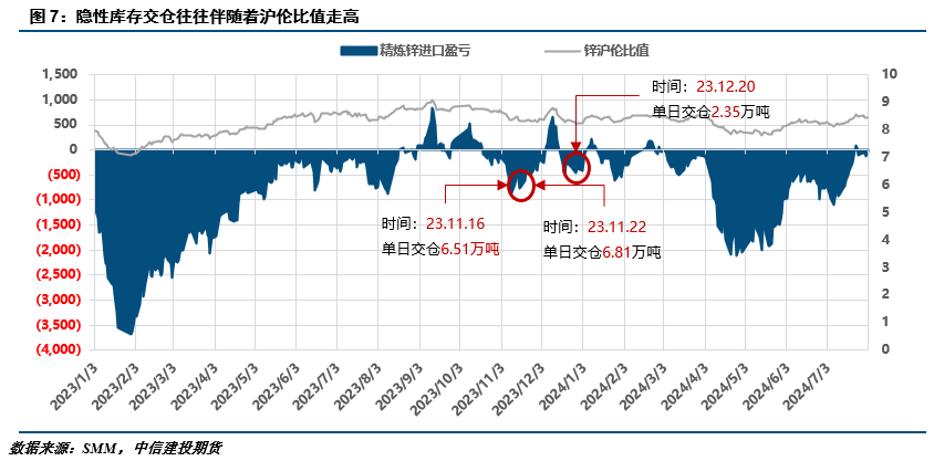 而即便5月冶炼厂如期检修减产,也需要考虑进口一侧对供应的冲击。随着前期新加坡隐性库存的显性化(4月16日伦锌库存新增7.85万吨),目前沪伦现货库存再度形成两极分化走势,考虑到“Rent Share”机制在锌锭低价及过剩格局下能够稳定盈利(具体逻辑参考【建投有色】铝仓单暴增之后如何看待LME库存扰动?),不排除海外巨头贸易商继续交仓的可能。按照23年末多轮隐性库存交仓的前车之鉴,内外高企的库存差压力下,国内锌锭进口窗口将逐步开启,当/次月进口或出现放量的情况,考虑到3月进口量仅2.7万吨,4-5月进口或能够形成对国内2万吨减量的有效补充。