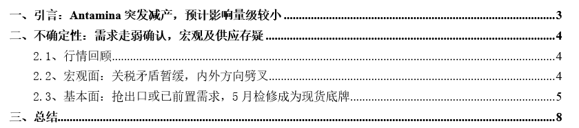 供需平衡表来看,考虑到出口有关税及反倾销限制,需求一侧难有增量;若国内5月顺利检修减产,则内外比价压力下进口窗口打开或持续补充,5月呈现紧平衡概率较大;若国内5月检修减产继续推迟(前提是硫酸等副产品维持高价),则在消费走弱的情况下,库存或逆势累增出现拐点。