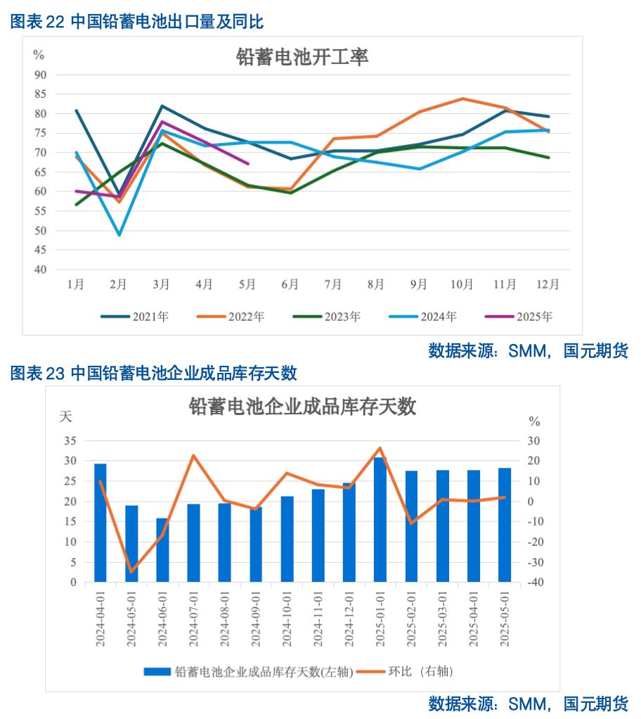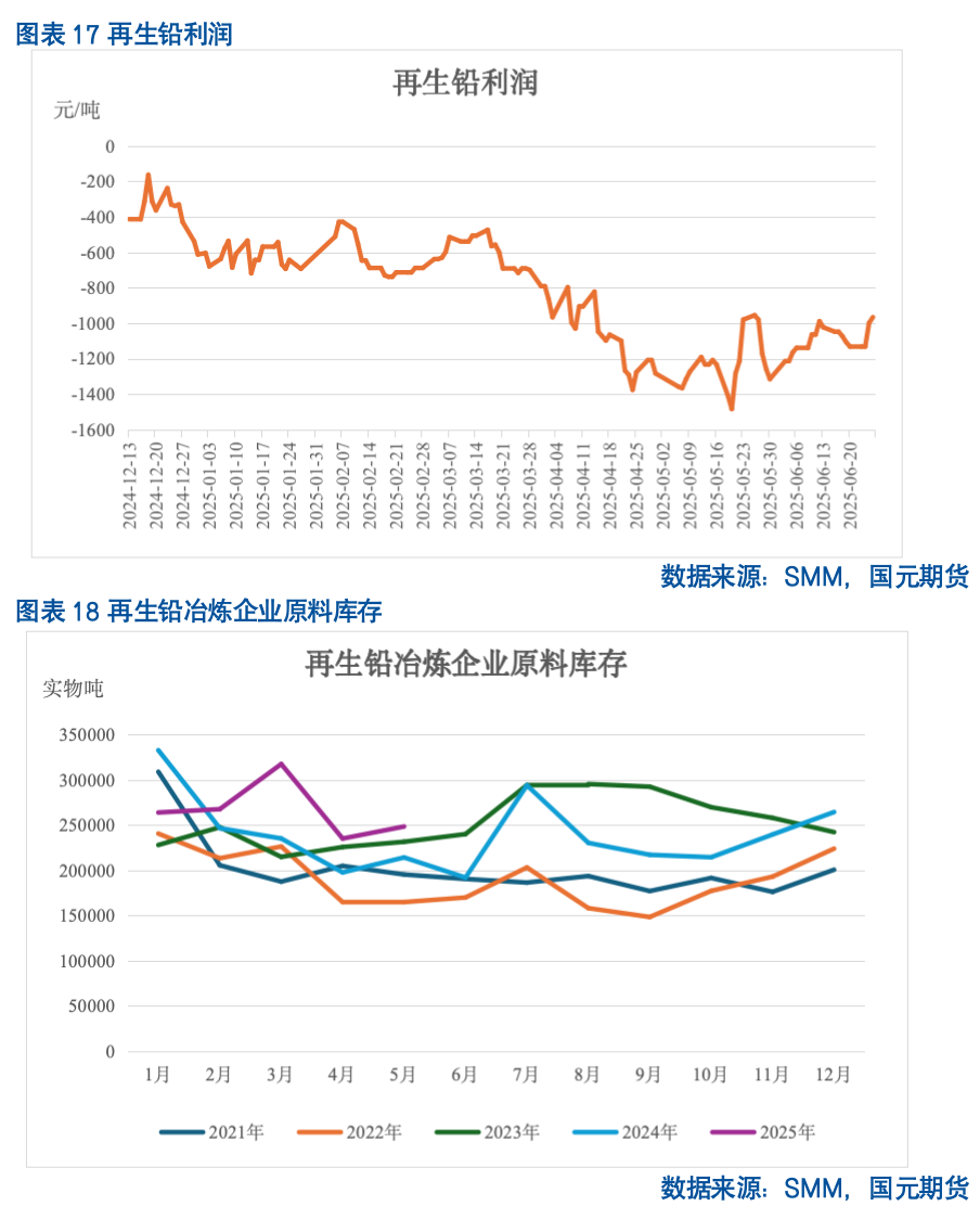 从库存水平来看,随着终端需求进入淡季,经销商反馈走货速度放缓,库存高企难以去化,2025年5月经销商库存较2024年底增37.86%,较近五年同期均值增23.12%,但较去年同期减3.91%,主要为2024年存在部分需求前置的反季节性因素。铅蓄电池成品库存经过电池企业减产放假后,恢复至常规水平,2025年5月铅蓄电池成品库存较近五年同期均值减11.33%,根据SMM调研情况,6月淡季影响部分减弱,下游上调铅蓄电池收购价,6月铅蓄电池成品库存或维持降势。
