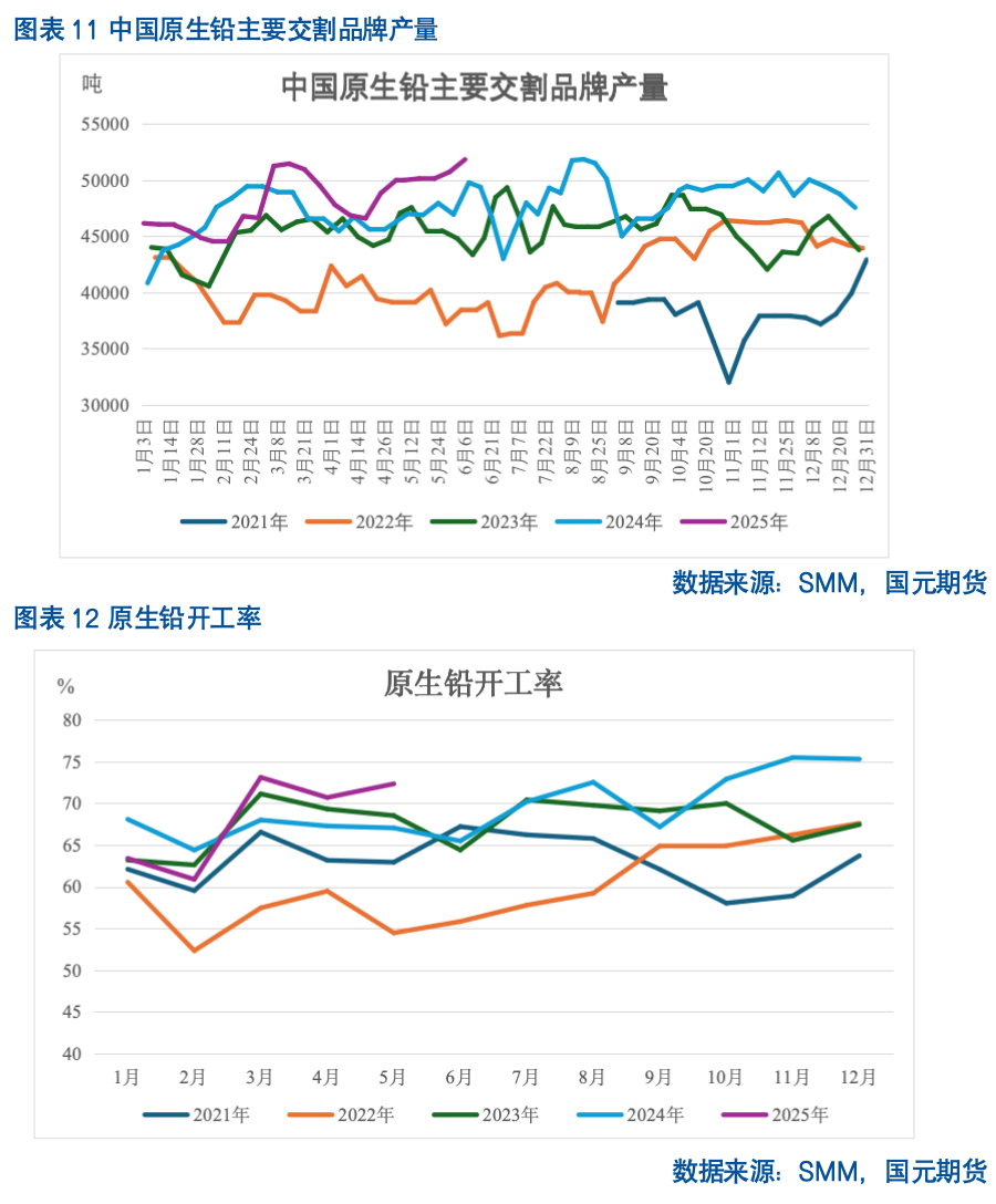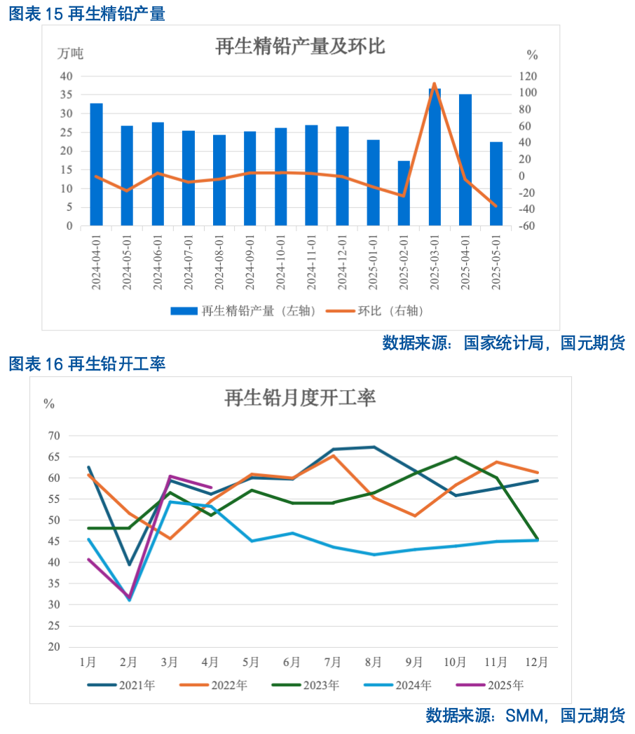 上半年尽管有新增再生铅冶炼产能陆续投放,但再生铅产量受环保限产以及原料端偏紧限制较为明显,2025年1-5月再生铅产量同比减1.61%,但由于2024年四季度环保限产影响更加显著,环比实现了4.18%的增幅;1-5月开工率在终端替换需求周期性增加拉动下同比增0.12个百分点,环比增2.17个百分点。