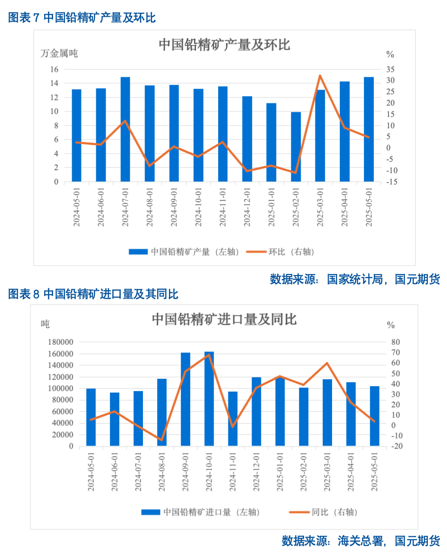 矿石进口方面,由于年初国内冶炼厂签订长单量级增加,1-5月国内铅精矿进口量同比增32.05%,但在海外矿山投产不及预期的背景下,海外矿石散单进口有限,环比减15.91%。