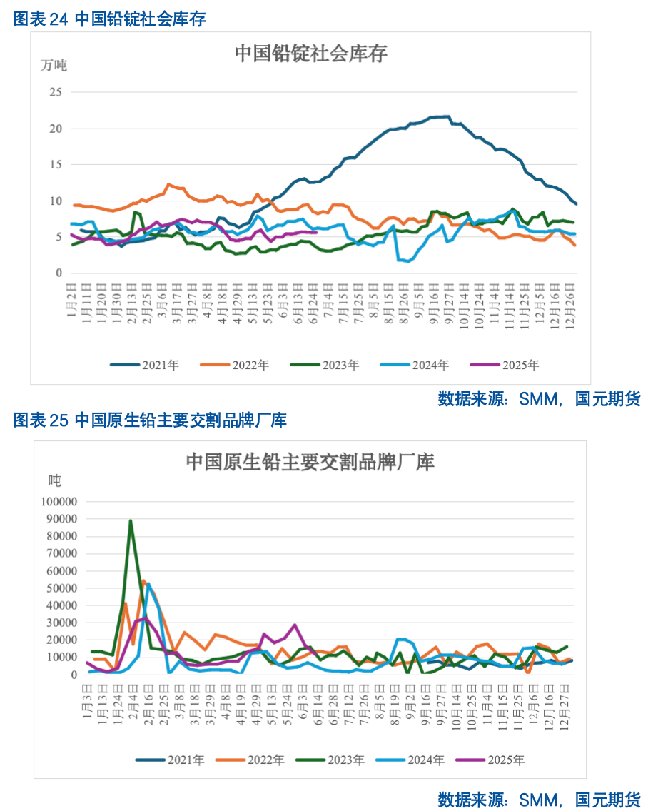 上半年需求回落,再生铅及原生铅厂库存在不同程度的累积,2025年截止6月20日,再生铅厂库较2024年底增681.9%,原生铅冶炼厂较2024年底增82.93%,社会库存较2024年底基本持平,社会库存累去库节奏主要受交仓因素影响。