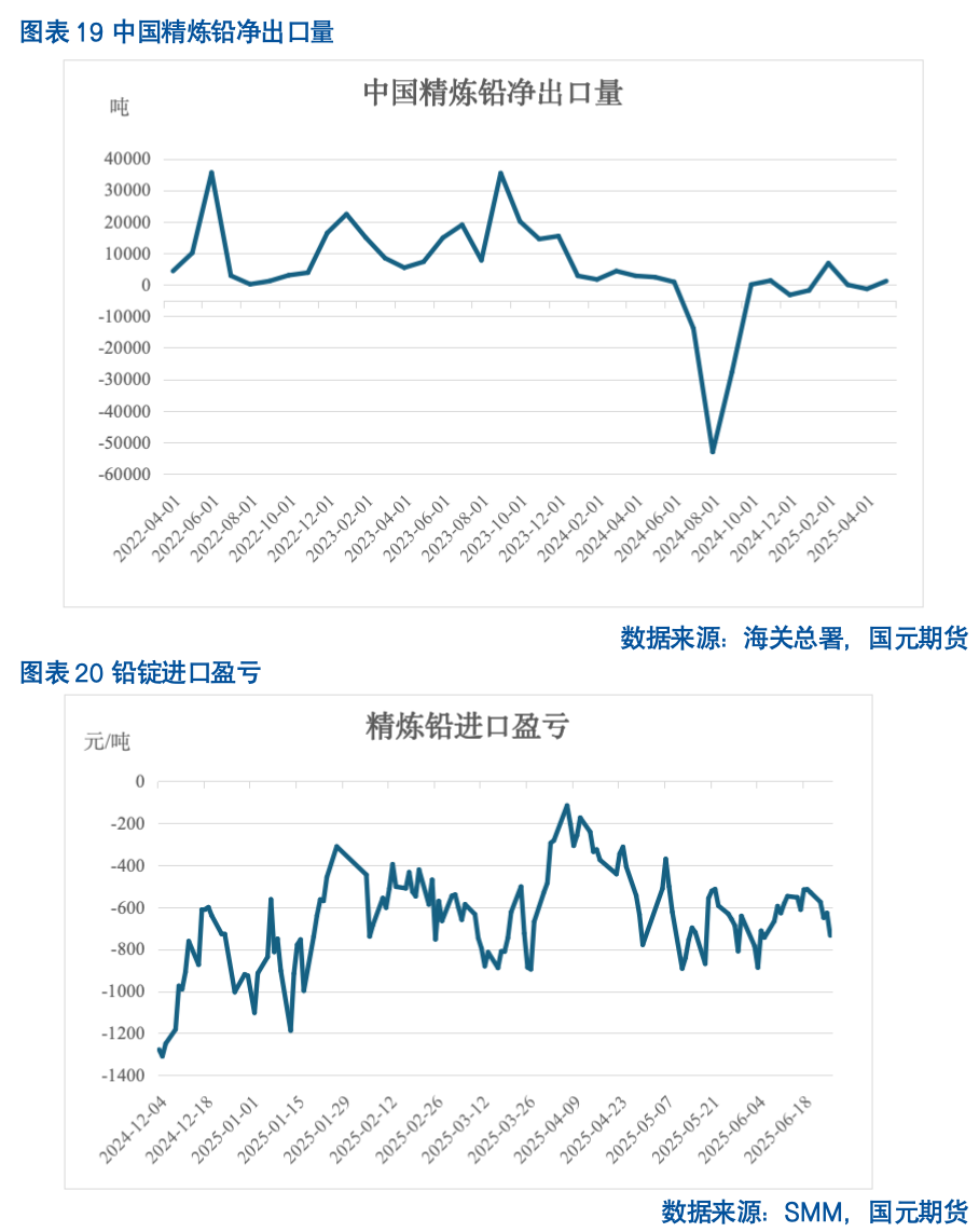 对于进口方面,上半年需求端受春节假期及淡季影响,整体较2024年下半年转弱,铅价整体内弱外强运行,导致进口窗口打开机会较少,仅有部分粗铅进口补充。