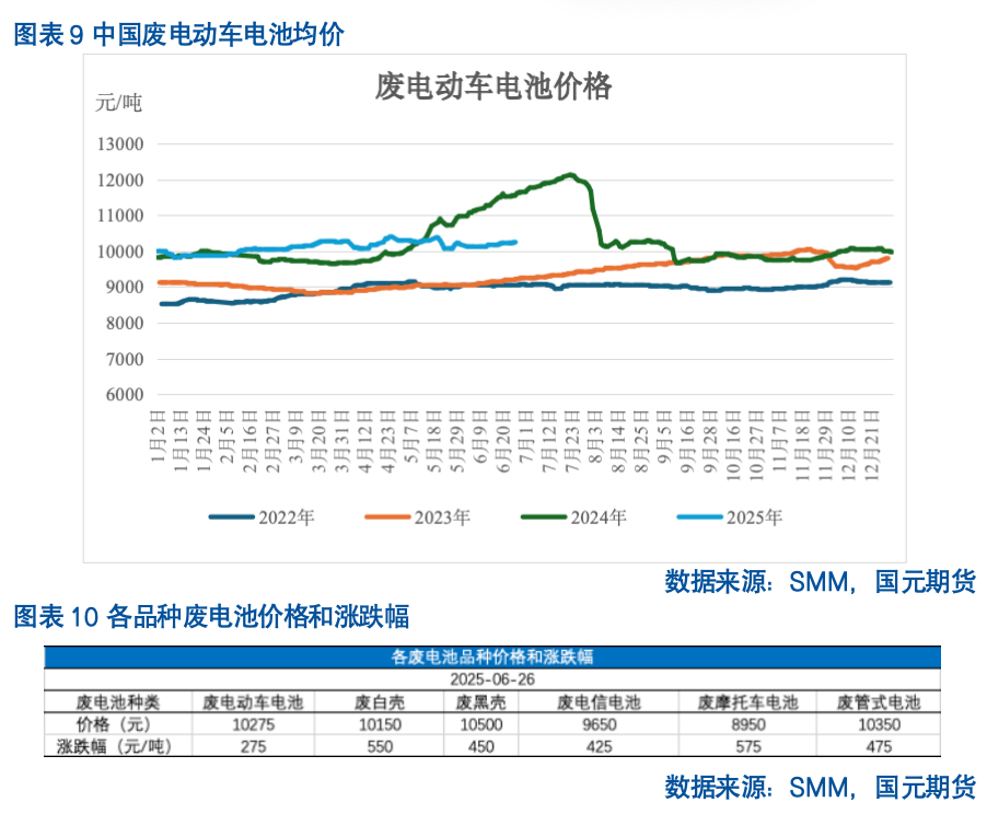 上半年来看,春节前后为铅蓄电池替换旺季,3月后铅蓄电池替换需求转弱,废电瓶供应明显收紧,虽然再生铅炼厂大规模减产配合炼厂集体降低废电瓶回收价,引发回收商抛售情绪,阶段性缓解了废电瓶供应紧张的局面,但在铅蓄电池替换淡季中,废电瓶实际供应较为有限,废电瓶供应短期释放后再次收紧,倒逼冶炼企业上调废电瓶收购价,据SMM调研显示,部分企业反馈尽管上调废电瓶收购价,但到货量较去年同期下滑约50%。在此背景下,上半年废电瓶价格仅春节前后小幅下降,大多时间处于10000元/吨上方的历史偏高水平。