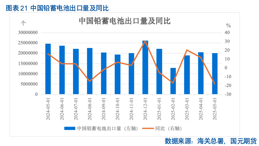 在出口方面,上半年铅价呈现内强外弱的走势,叠加关税政策扰动,国内铅蓄电池出口优势减弱,1-5月国内铅蓄电池出口量同比减3.24%,环比减12.85%。