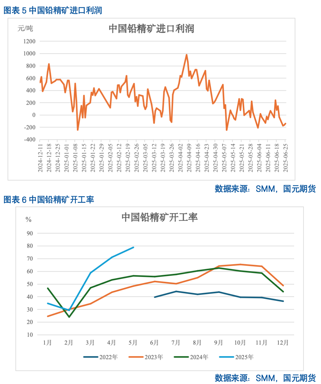 国内矿山方面,上半年国内铅精矿加工费维持低位,国内矿山利润维持偏高水平,矿山生产积极性较强,2025年1-5月铅精矿产量同比增加15.61%,环比受一季度北方矿山季节性减产及假期因素影响,小幅减4.5%,矿石供应较2024年明显恢复。开工率数据来看,1-5月矿山平均开工率同比增6.17个百分点。对于下半年国内矿山生产情况,下半年国内北方矿山在11-12月才会出现季节性减产,整体影响较上半年减弱。