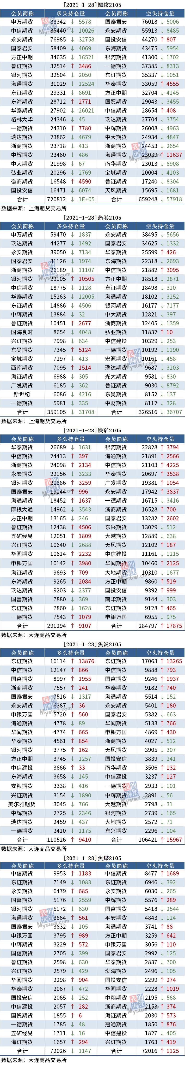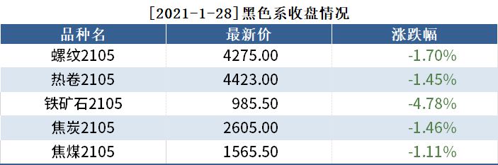 截至1月28日收盘,螺纹2105收4275,跌1.70%;热卷(4423, -65.00, -1.45%)2105收4423,跌1.45%;铁矿(986, -49.50, -4.78%)石2105收985.5,跌4.78%。
