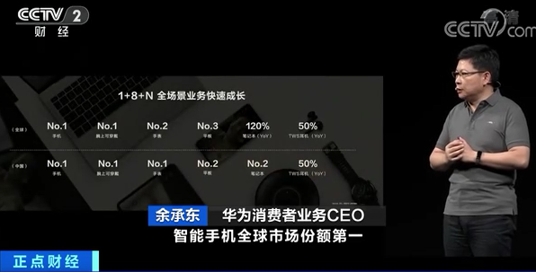 华为消费者业务CEO 余承东:在海外,疫情的情况下,华为仍然实现了智能手机全球市场份额第一、手表手环等穿戴设备全球市场份额第一,同时也是中国市场份额第一。