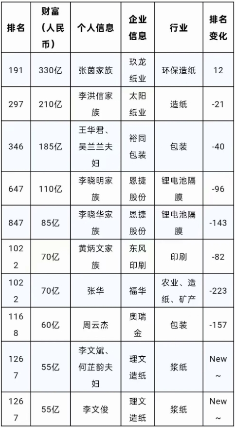 据大致统计,进入“2025胡润百富榜”的印刷包装造纸企业如下: