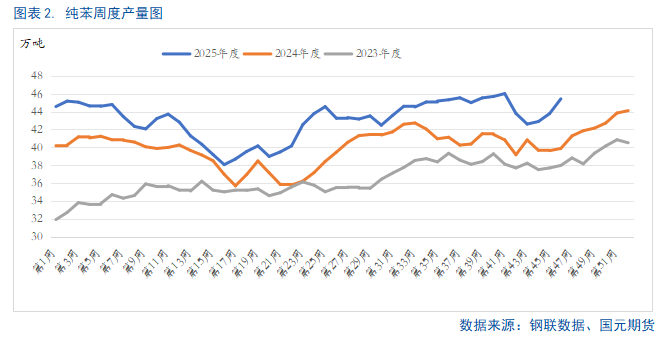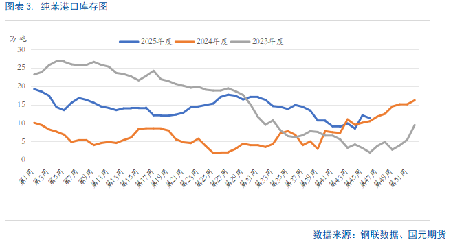 截至11月13日当周,我国纯苯市场库存压力显著,高企的周度产量与港口库存共同制约了价格的短期修复空间。库存方面,截至11月10日,江苏纯苯港口样本商业库存总量为11.3万吨。虽然环比下降6.61%,实现小幅去库,但同比仍上升7.62%,整体库存水平仍处于近年同期高位。供应方面,本周国内石油苯产量达45.43万吨,环比增长3.77%,同比增长13.94%,供应压力持续增大。综上,当前纯苯市场呈现出“高供应、高库存”的双重压力格局,在基本面未见实质性改善前,预计价格上行空间将受到持续压制。